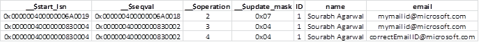 select __$start_lsn, __$seqval, __$operation, __$update_mask, ID, name, email