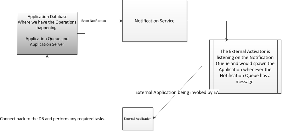 The Application event or service communicates with the Notification Service (Event Notification). The External Activator services is continuously listening on the notification queue. When it encounters a message in the Queue, it invokes the External Application, which can process the required operation.