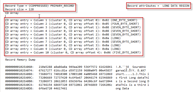 Also as visible from the column offset information from the snapshot above, we can see that the fixed length columns are stored first (notice the column offsets) and then the variable length columns are stored, Which is