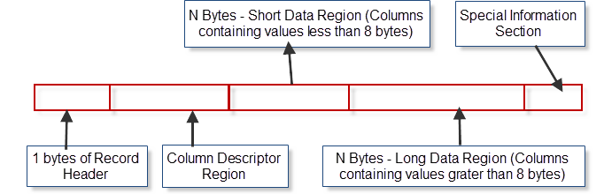 Contains columns which are less than equal to 8 bytes in length. Since the length of the columns are not directly stored in this region, in tables with a lot of columns, it can be expensive to access the last column, as this would require processing all the previous columns (length of each column) and then computing the start and end of the desired column. To mitigate this, the columns are divided into clusters of 30 columns each. A Short Data Cluster Array(byte array) is then created in this region to store the length of each cluster. Since there are only 30 columns in each cluster (with each column being max of 8 bytes), a single cluster can have a max length 240 bytes.