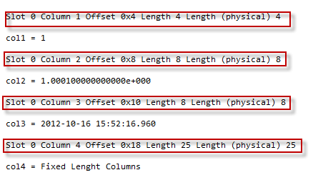 As can be seen, the first column value starts at offset 0x4 (decimal-4). Which is after the first 4 bytes for the Row header and the length of the fixed length columns. The other column values follow the similar pattern.