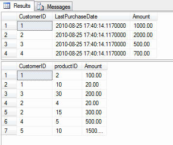 Notice the changes in the LastPurchaseDate and the Amount columns for the customer (1,2,3,4) and a new record with CustomerID 5 being inserted into the table.
