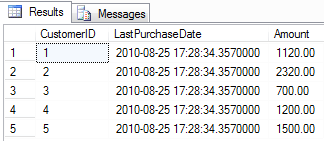 GROUP BY CustomerID) as DS(CustomerID, PurchaseDate, TotalAmount)